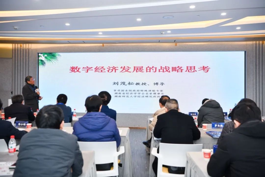 刘茂松教授从世界经济发展出现新变化、数字经济是一种新经济形态、数据驱动高质量发展战略路径等三个维度作了《数字经济发展战略思考》的主旨演讲。他认为就湖南目前情况看,2022年全省数字经济规模为1.5万亿元,是全国13个数字经济规模超万亿元的省市之一,但占GDP的比重只30.8%,比全国平均水平41.5%低了近11个百分点,比全球平均值45%更是低了14个百分点,总量规模偏小。从结构上看,数字产业化的占比超过25%,高于全国18.3%的平均水平,其中人工智能核心产业产值增长20%,这是我省的优势。但产业数字化占比却低于全国平均水平6个多百分点,是我省数字经济的短板。由于产业数字化是改造旧产业形态、打造三个高地的根本手段,是数字经济的最终目标,对我省产业数字化短板,要采取强有力措施解决。他建议湖南数字经济高质量发展应采取强化数字技术自主创新,开发高新技术新兴产业,加快推进企业数字化转型,实现传统产业数字化升级等四大对策来助推湖南经济高质量发展。
